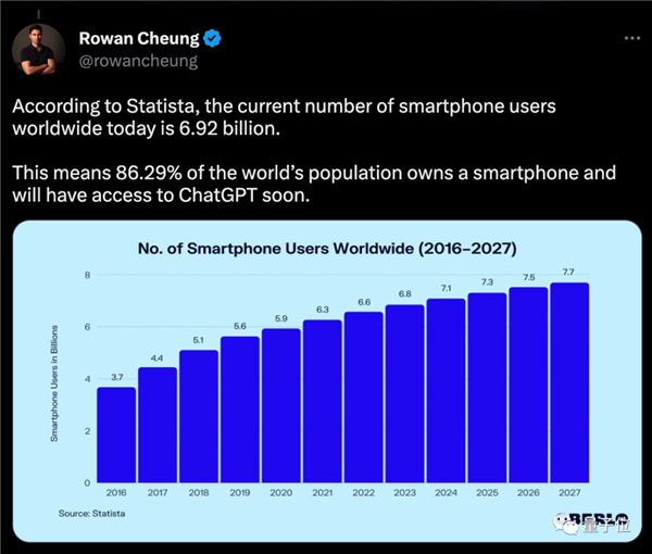想象一下,全球有着几十亿智能手机用户,占到人口总数将近90%。而很快大家都能在手机上体验ChatGPT了。